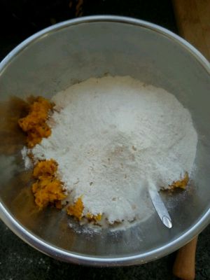 把蒸熟的南瓜、面粉、酵母、糖倒入盆里拌匀,然后揉面,揉到面团光滑,盖湿布静置发酵。
