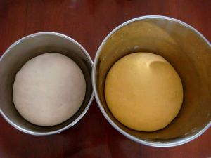 用同样的方法做好白面团,盖湿布静置发酵。