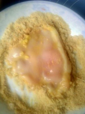 把鸡排正反两面都沾上面包糠。可以用手压一下,尽量多粘一点面包糠。