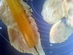 切好得片,用擀面杖轻轻敲打,让肉每一处都一样薄厚