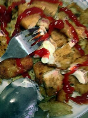 做好得可以切块,放上孜然粉和番茄酱沙拉酱