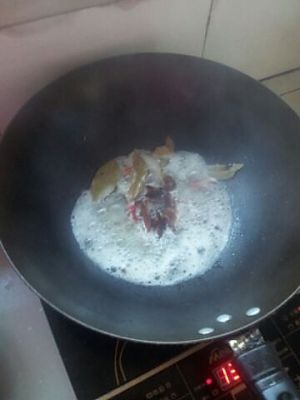 大火烧热油锅,把姜蒜及干香料全放入油锅爆出香味