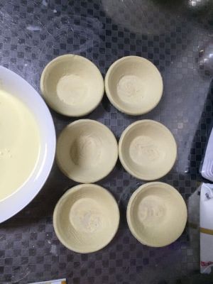 将蛋挞水倒入蛋挞皮中,大概七八分左右。