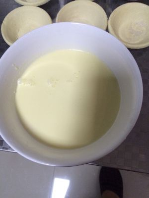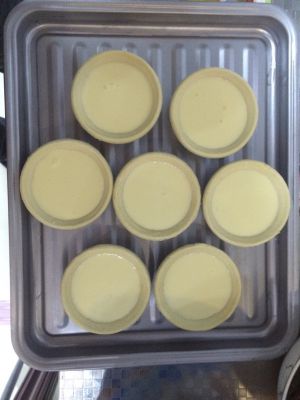 过筛后就是蛋挞水; 将塔皮摆在烤盘内。倒入蛋挞水,8分满即可。装入烤盘,放入约热好的烤箱中层。210度,25分钟左右,烤至蛋挞表面出现焦点即可。
