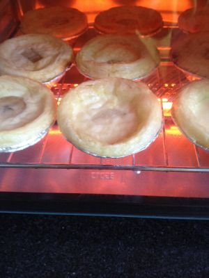 将烤箱预热后,调至210度上下管一起热大概15分钟左右,将蛋挞放入烤箱。