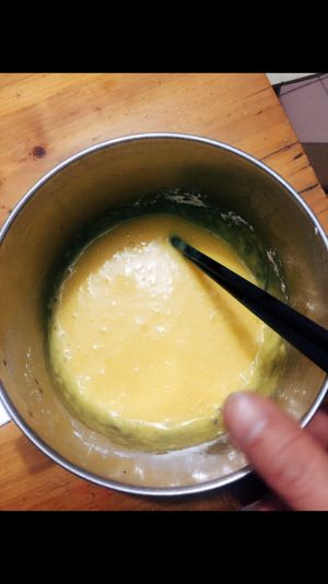 鸡蛋打散.把其他材料全部到入,上下搅拌,如图状,筷子拎起来会慢慢滴。