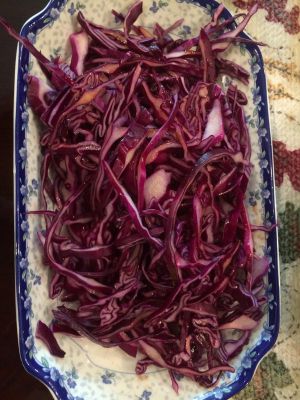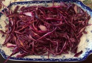 紫色甘蓝切细丝放冰箱冷藏, 吃之前撒上色拉汁即可。