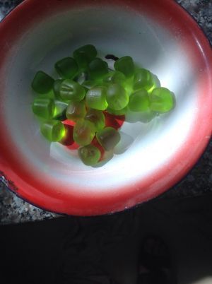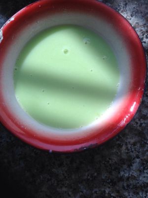 这次只做了两种颜色,青苹果味的是最底下那一层,买的两包,倒入小盆子中,上微波炉叮35秒,我们家的微波炉不知道功率是多少,自己琢磨的