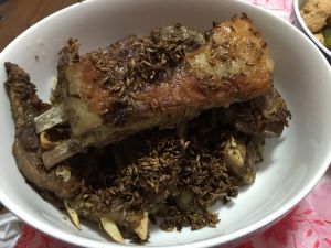 羊排煎成金黄色即可出锅。锅里煎熟的孜然粒可不要浪费了呀,和羊排一起装盘,喜欢吃辣的盆有还可以撒点儿辣椒面,香香哒。