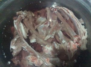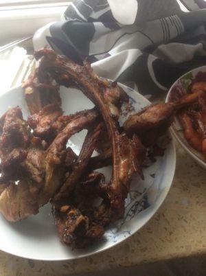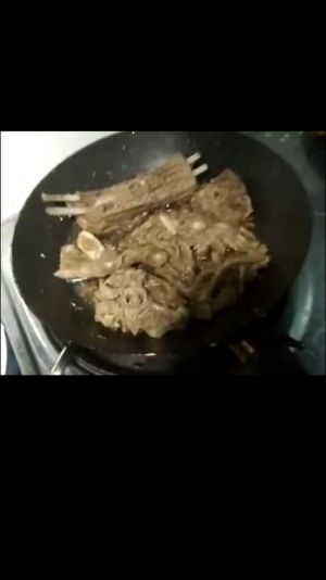 煮熟后捞出羊排,平底锅内放少许油,将羊排肉厚的一面朝下放入锅内小火慢煎。可以适量撒些盐和孜然粒。(这张图是老公拍的,实在是不太清楚)
