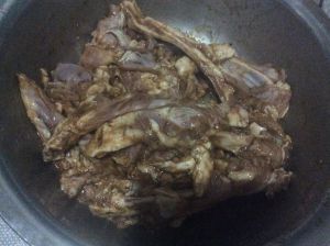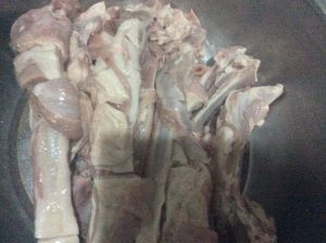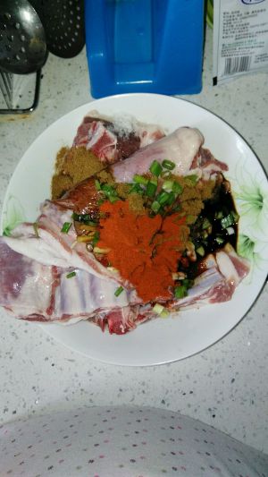放上胡椒粉,孜然,葱,姜,老抽,料酒,盐,糖,建议准备一次性手套去抹均匀,因为粉粉会进入指甲里,很不舒服,也会。