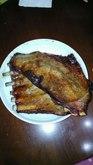 烤30分钟后将排骨翻面继续烤 , 十分钟后即烤好,随便配点香菜就完美了