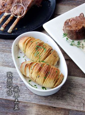 烤盘上抹油,铺好土豆片,摆上羊排,烤箱200度,半小时