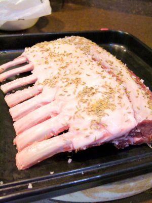 把腌好的羊排拿出撒点孜然,放入烤箱,上下火,220度烤50分钟,我这个时间有点久了,烤了60分钟,所以要减10分钟