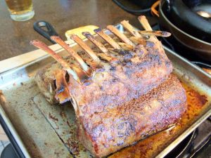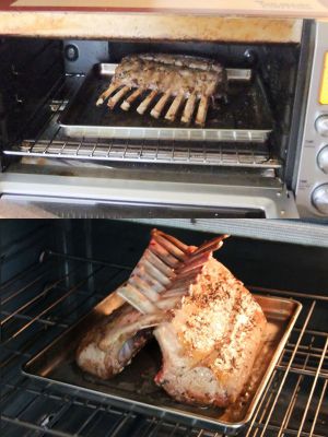 如果你做两排羊肋的话,可以各自煎好后竖立起来交叉架起再烤(如图)。 把羊排入烤箱烤15-18 分钟 ( 两排羊肋的话烤 30-45 分钟) 烤制时间可按您喜欢的生熟度适度增减。
