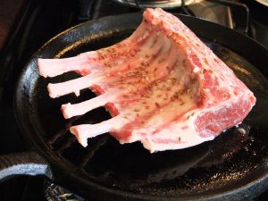 把烤箱的架子移到中间部分,预热烤箱至400 华氏度 (200 摄氏度)。 平底锅里热上一大勺的食油,把羊排的四周各煎1-2分钟至表面稍带金黄色为止。煎好的羊排熄火摆锅里静置5分钟。