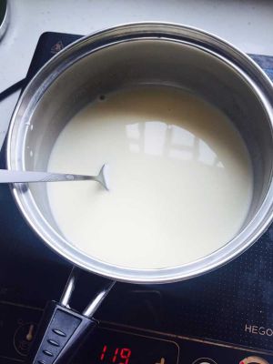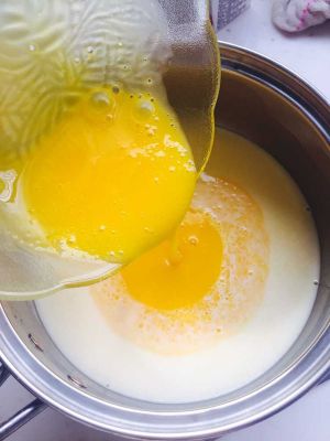 将牛奶、淡奶油、白砂糖依次放入容器中,搅拌均匀,置于小火上加热至糖化。放凉后加入蛋黄(蛋清过滤出)