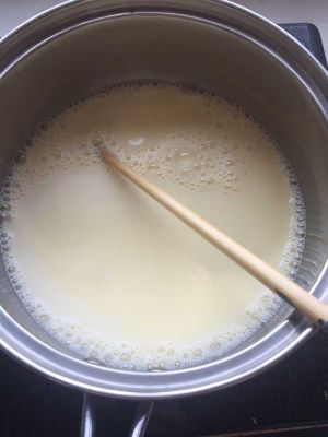 加入90克白砂糖后,开小火加热至糖完全融化,关火,不要让牛奶烧开,置一旁待冷却