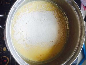 待牛奶冷却后,倒入打散的5个蛋黄并搅拌均匀