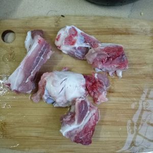 大骨头冷水浸泡洗净,冷水下锅,加料酒、姜片去腥烧开