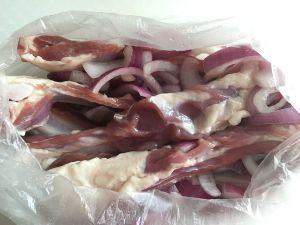 羊排清洗干净后沥干水分或是用厨房纸巾擦干水分,然后把一整头洋葱切丝加入羊排里,在加一勺盐。将盐均匀的涂抹在羊排上,用双手揉搓每一根羊排1-2分钟,将盐味搓进肉里!然后将洋葱和羊排装进袋子里,放入冰箱冷藏室里腌制一晚上。