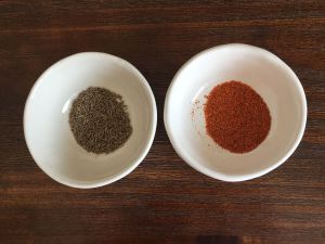 将羊排取出来,撒少许孜然和辣椒粉。图2里的孜然和辣椒粉撒少许即可,不要全部用完!