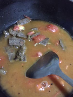 放西红柿炒出汁,有洋葱放洋葱,后加牛肉,加水大火煮沸