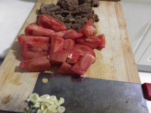 炒好的牛肉倒入炖锅,加两碗清水,烧热,加入切好的番茄