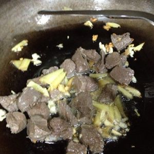 花生油烧热,关小火,下姜蒜末炒香,下牛肉稍微翻炒