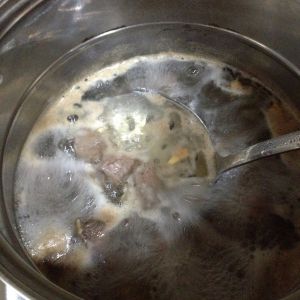 加清水(比全部淹没食材还要多一点),大火煮开后中火慢炖。中途加盐调味。牛腩酥烂,汤汁浓稠即可(中途如需加水,加开水较好)。