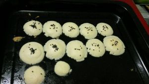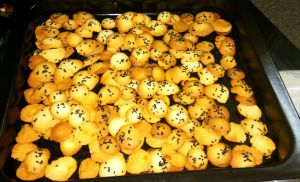 多用锅预热,放入蛋黄芝麻酥,烤12-20分钟即可(根据饼干的厚度大小调整烘烤时间);