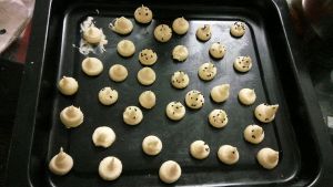 将蛋面糊装入挤花袋中,挤在烤盘中,使其呈扁圆球状。