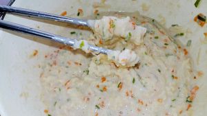 加适量水,撹成较干的面糊。面糊太湿粘手,可加多适量面粉。