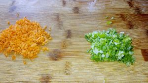 土豆镲细丝,加入盐,糖,葱,胡萝卜,拌匀,腌2分钟后加面粉,搅匀后成糊状。(土豆出水不要倒掉,加面粉时不另外加水。)