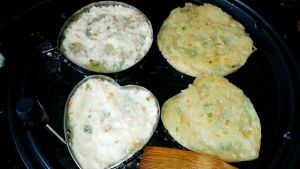 最好用不沾锅,我用的电饼铛,放少量油,用勺子舀少量面糊入锅煎,土豆饼很好整形,有模具会更方便,两面煎至金黄,出锅。蘸番茄酱吃更美味~