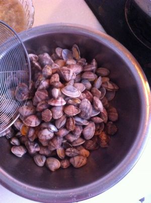 锅内放入水烧开,加入姜片、料酒,放入干净的花蛤,当花蛤张开时候捞出再次冲洗去沙,没有张开的就是不新鲜的,挑出丢弃。