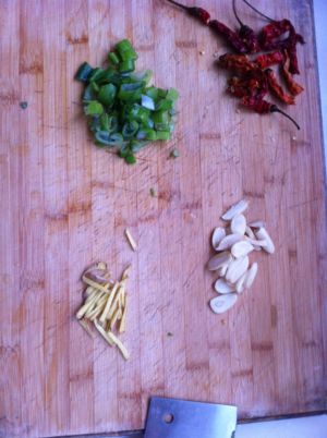 干辣椒一切两段,蒜切片,姜切丝,葱绿切段。