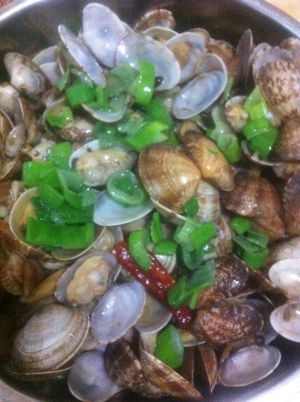 热锅凉油,蒜片、姜丝入锅炒香,辣椒、花椒入锅,花蛤炒入,三分钟后入味达美、料酒,三分钟后入耗油、白糖少许,三分钟后放入葱段炒香。