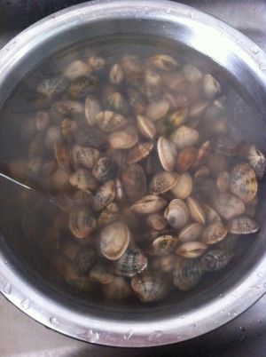 热半锅水,将花蛤热三分钟,开口,泥沙吐净,捞出沥干。