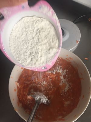 把出的水倒出备用,丝里放鸡蛋,数量看自己喜欢,我一般放四个,搅匀后加入面粉,在放少量盐,加面粉时不要一次加入太多,一点一点加入,同样搅匀后里面在放虾皮,不喜欢的可以不放,如果这些都做好后感觉面糊稠了,可以把事先去除的西葫芦水到里点,面糊以可以流动最佳