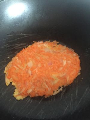 锅热后,加油;油热后改文火,加入拌好的糊糊,起锅摇晃至圆形,直径15厘米最佳,用铲或勺碾平稍厚部分。