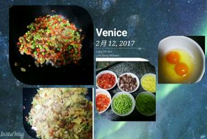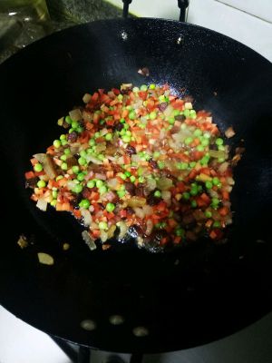 炒到米饭外面的蛋液凝固就可以了,把之前焯过水的蔬菜粒倒进去翻炒几下。