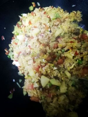 再把米饭倒下,一起翻炒匀。(中途油不够就加点,但是不要太多的油,不然不好吃。)