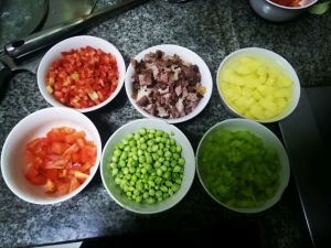 因为材料相对比较多,但是可根据自己家里的菜品来做调整,我这次用了番茄可以增加一定的鲜味,还加了土豆因为经过油炸的土豆会很香。都全部切丁备好。