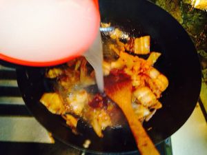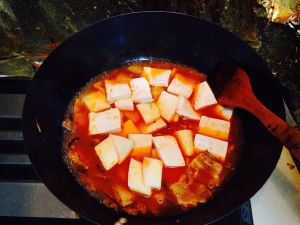 配菜炒好后加入淘米水,煮开后放入豆腐(豆腐用勺㨤成块放入就可以,省的切也好处理)