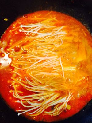 放入辣酱、金针菇、豆腐,小火炖10分钟即可出锅。