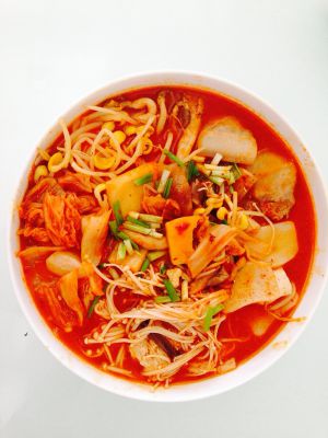 1、锅内加入3碗水,煮开后加入浓汤宝(牛肉浓汤)。 2、待汤块融化在水里后,加入泡菜、蔬菜、面煮两三分钟至面条熟透,再加入肥牛片、韩式辣酱、葱片、蒜片,煮半分钟左右至肥牛片熟透,即可关火盛入碗中。