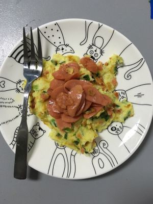 装盘啦!煎了一点火腿放在上面,喜欢蘸酱吃的筒子们可以加一些自己喜欢的酱在旁边。开吃吧!