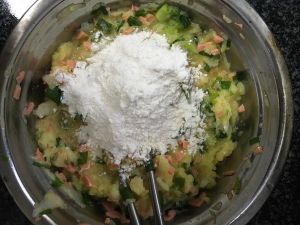 加水或者牛奶,盐也加进去,混合均匀。还可以加点自己喜欢的其它材料,比如火腿丝,香菇丝…