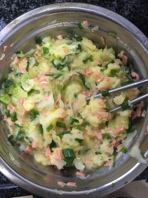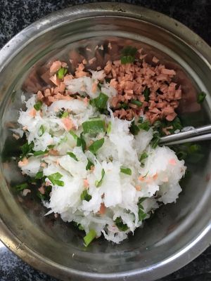萝卜擦丝,加盐渍出水分后将萝卜丝挤干备用。小葱切碎备用,火腿剁碎备用。